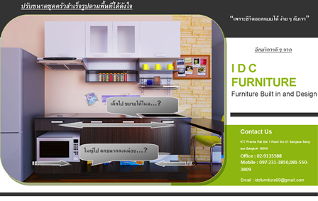 เพียงลูกค้าวัดขนาดพื้นที่ที่ต้องการติดตั้งชุดครัว และ แบบ ชุดครัวสำเร็จรูปที่ต้องการ และ ส่งข้อมูลมาให้ ทางดีไซน์เนอร์ของเราก็ปรับขนาด สั่งผลิตให้ท่านทันที ขอมูลเพิ่มเติม ติดต่อ ได้ ที่ 02-101-8709 หรือ ติดต่อ คุณ อุ้ม 097-231-3850 LINE ID : @idc99ft